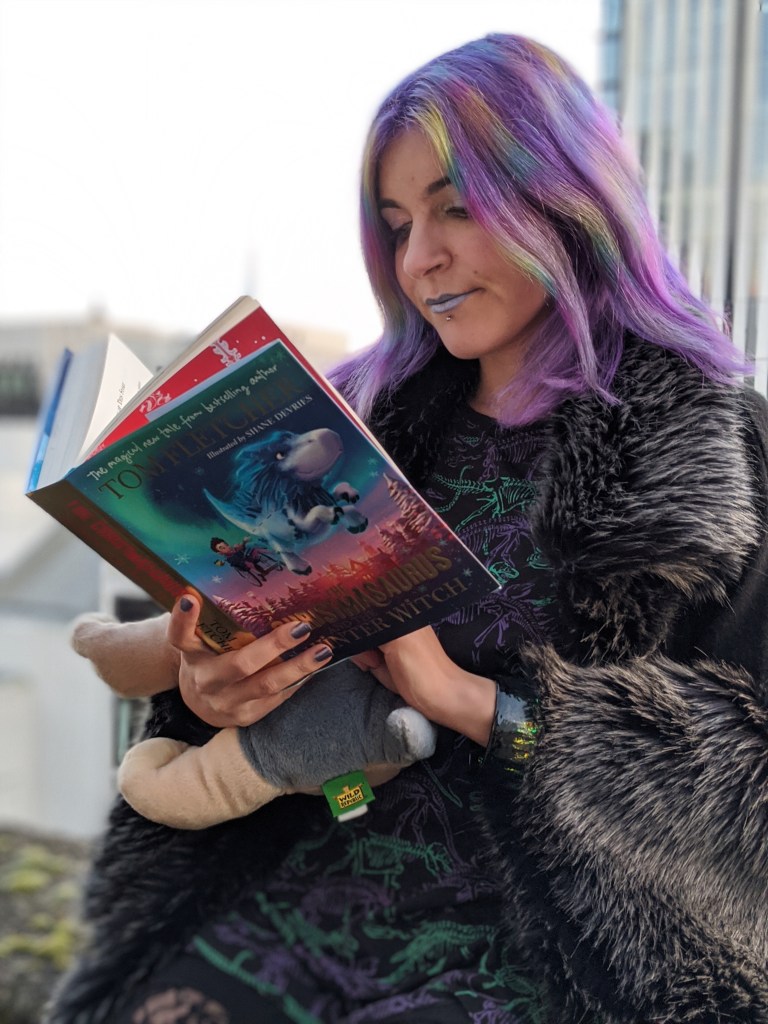The book is The Christmasaurus and the Winter Witch by Tom Fletcher, illustrated by Shane Devries.