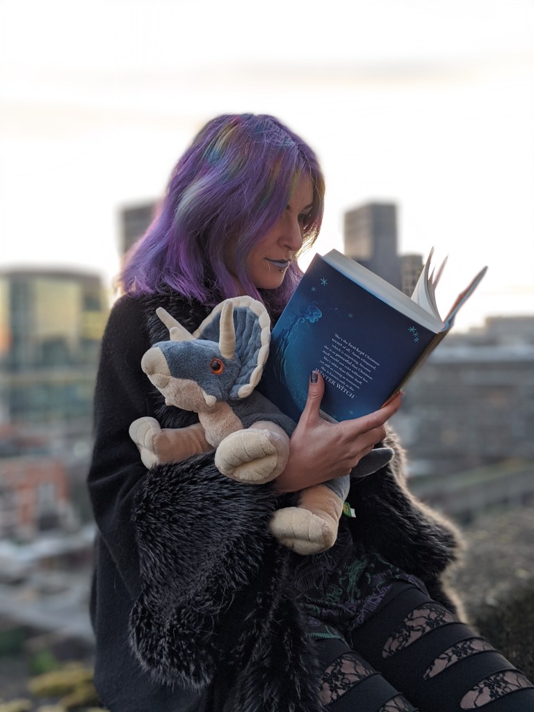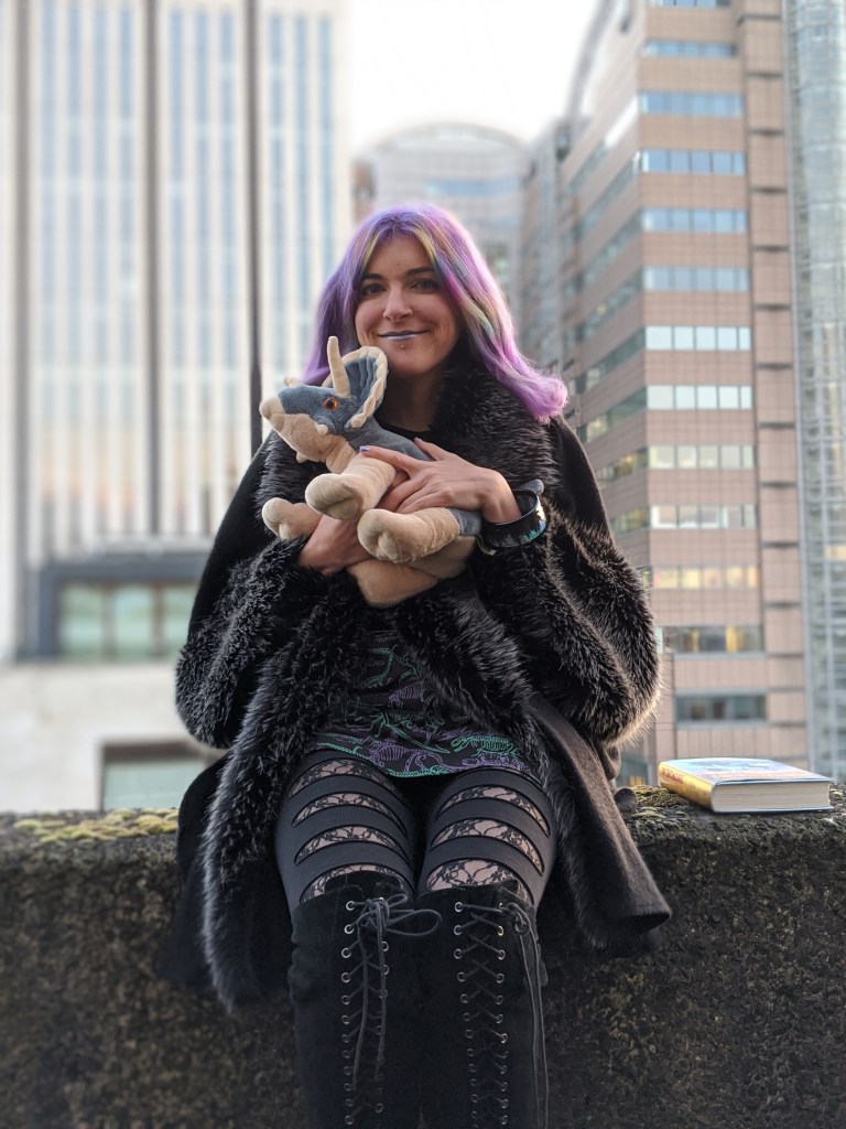 The triceratops plushie and the dinosaur dress are from the Natural History Museum in London.