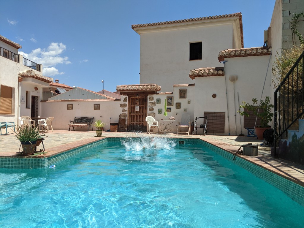 Alexis and I are currently pet-sitting in the south of Spain. Watching him jump in the communal swimming pool made me want to write a haiku.